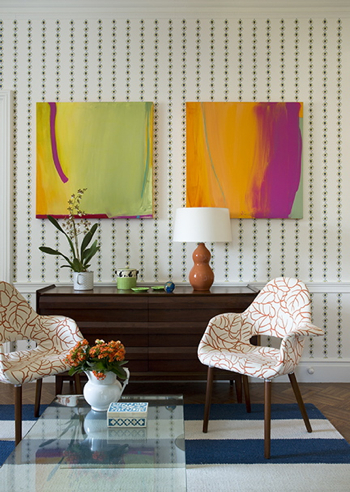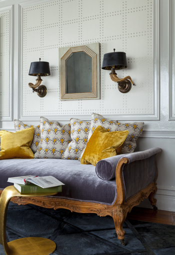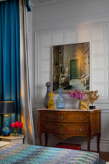 Paula and Kate McCusker of Theodore & Company converted the home’s former chapel into a blue and cream formal but relaxed living. They removed the old altar to expose a bay window for extra light. Artwork included a graphic black and white work by Picasso.