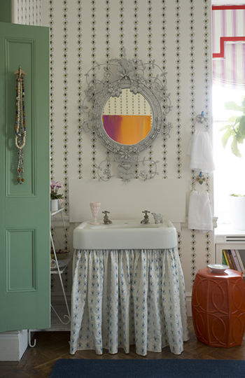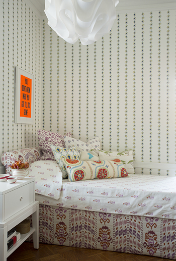 Kate Maloney Albiani designed an adorable nursery with tiny painted fairies on striped lavender walls. Details include double glass pulls on the built-ins, a poem made from old-fashioned reading cards, and a closet filled with tiny clothing.